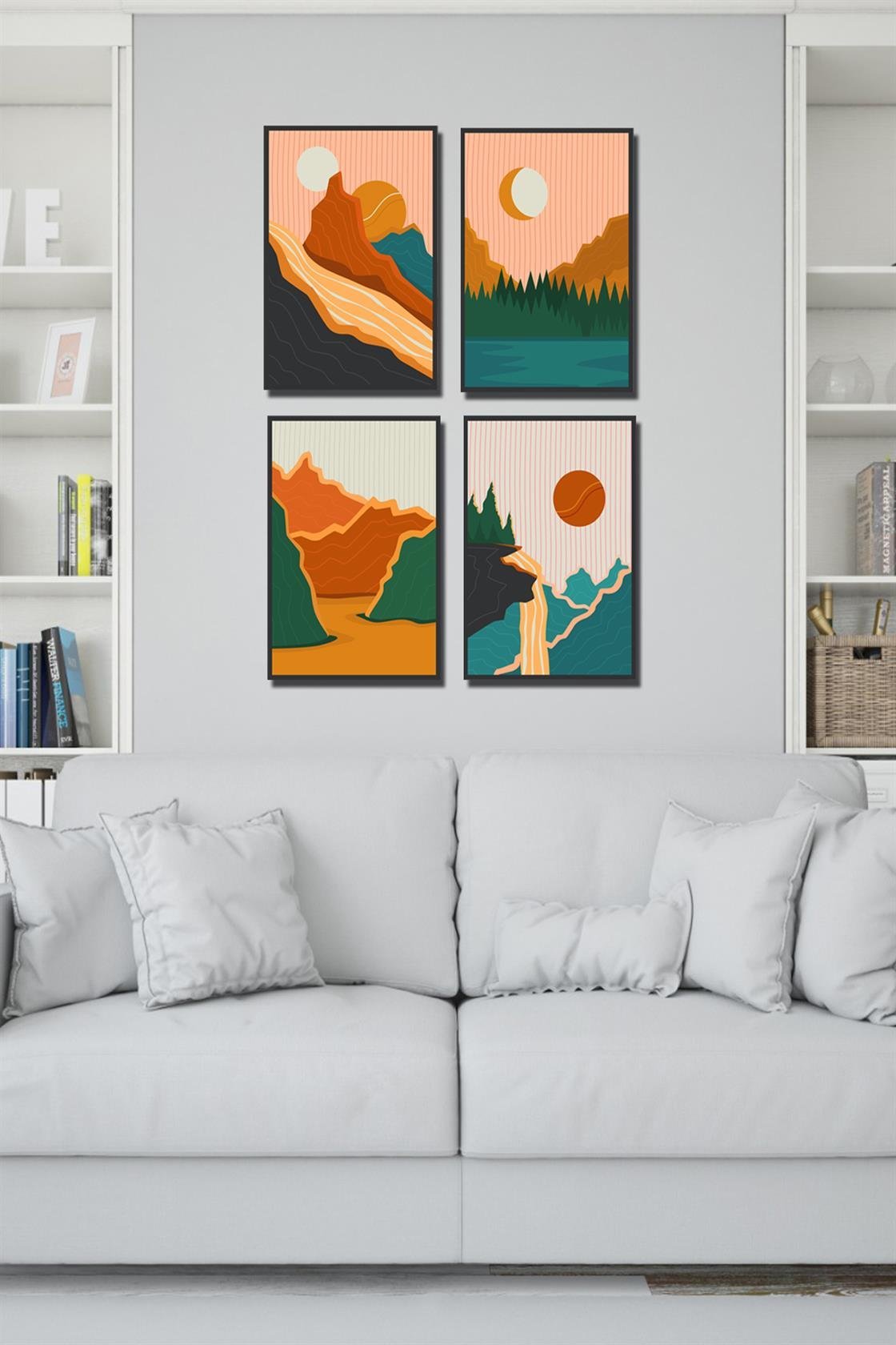 Renkli sanatsal 4'lü tablo seti siyah çerçeveli